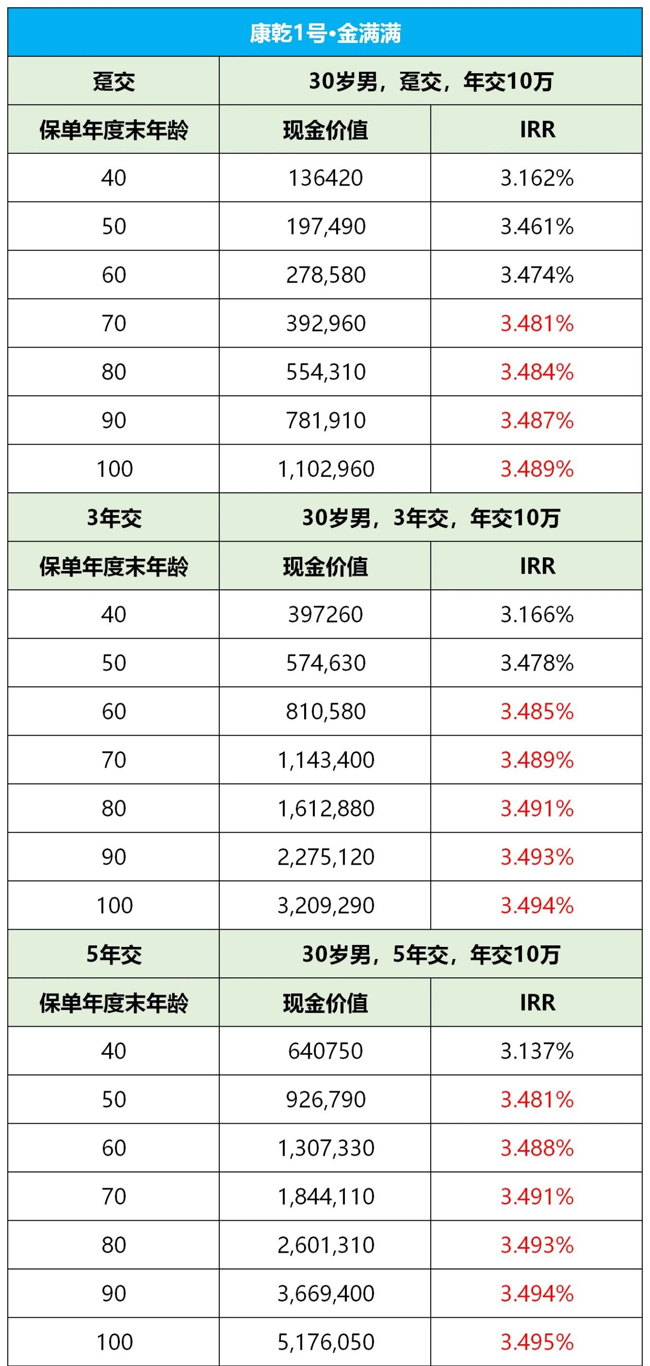 这款康乾1号,在多个年龄段,IRR遥遥领先!最高可达到3.495%,无限接近3.5%!