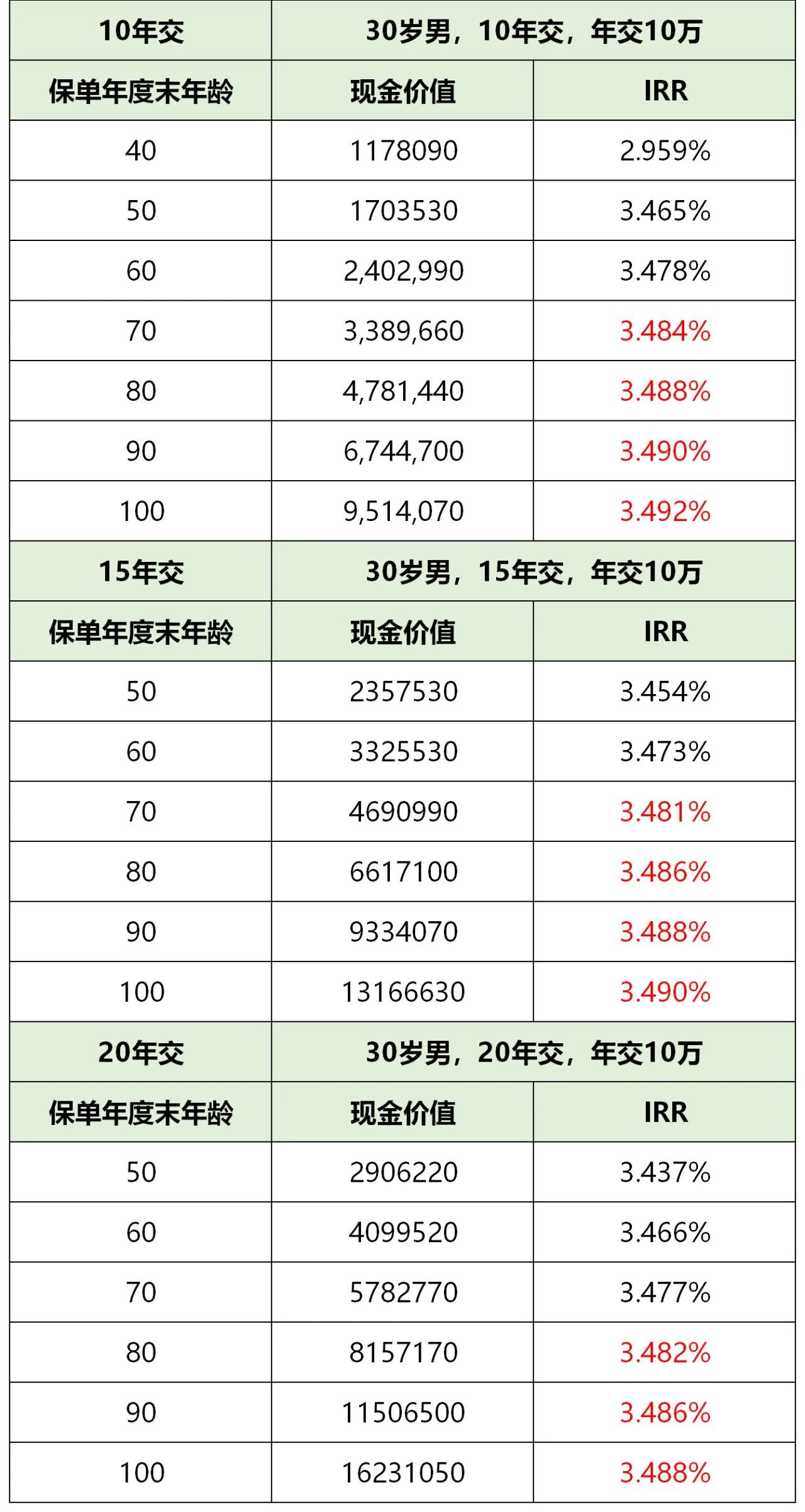当他100岁时,保单现金价值320.929万,为所交总保费的10.7倍,IRR为3.494%。