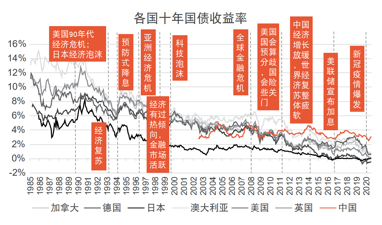 过去35年,世界主要经济体的十年国债收益率涨跌不停,整体下滑趋势明显,德国日本甚至跌到了0以下!