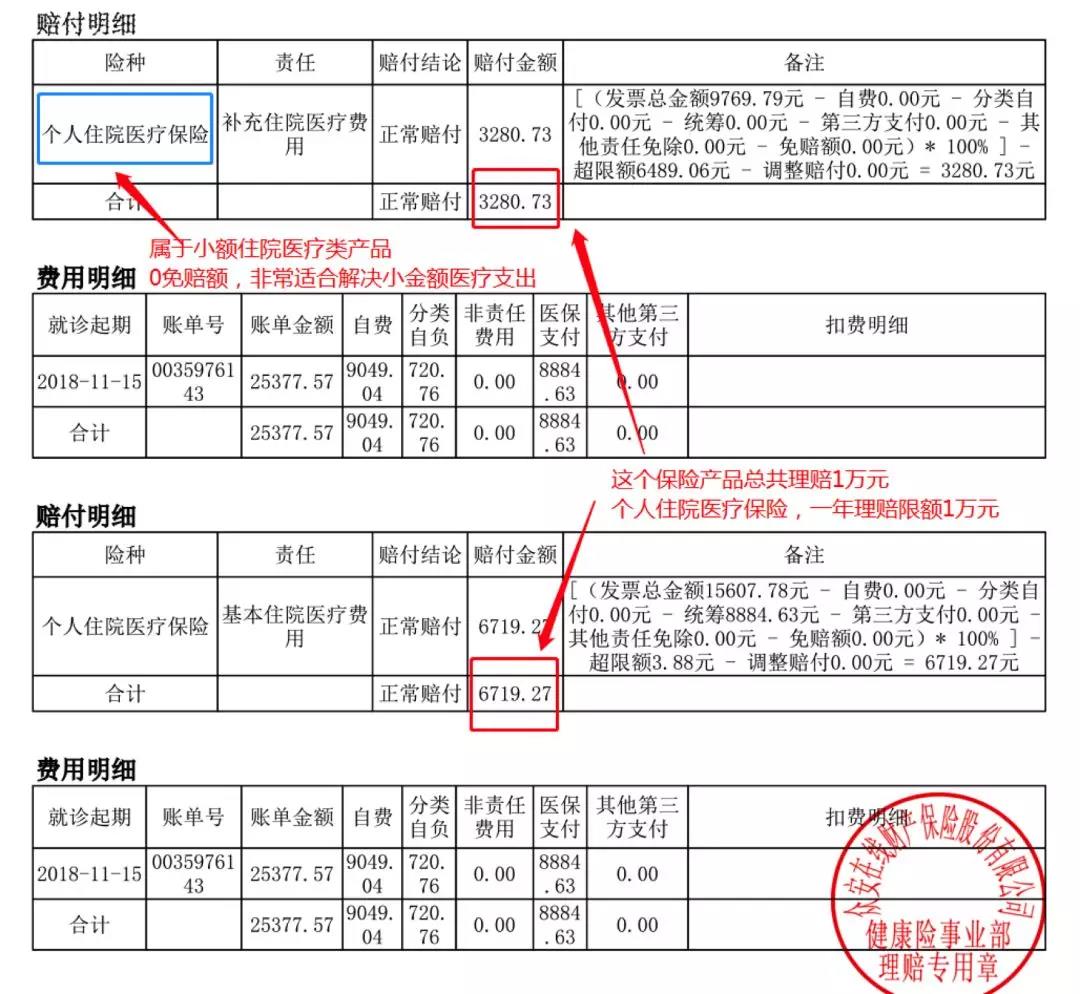 这是一款小额住院医疗报销产品的理赔效果,解决是常见高发的住院理赔问题,0免赔额,报销比例100%,社保内,社保外均可以报销。
