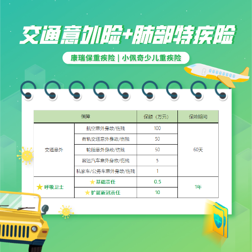 活动期间内购买指定活动产品(康瑞保、小佩奇),被保人可获得交通意外赠险 + 呼吸卫士肺部特定疾病险一份。