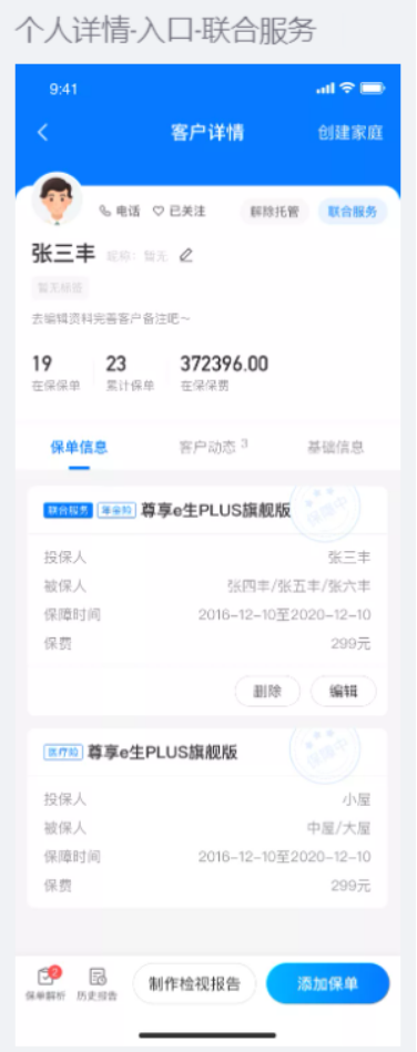 - App端发起联合服务或查看联合服务数据的入口在客户列表及客户详情页面