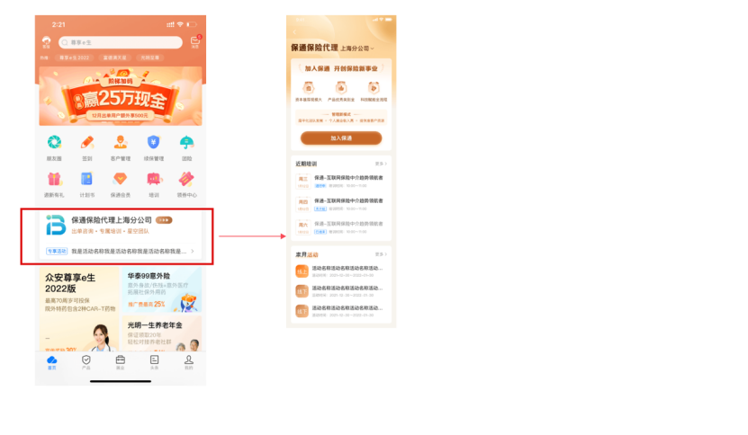 配合各分公司实际业务发展,针对性展示分公司培训、活动及产品方案等,同时集合了多个线上产品工具,形成线上运营及线下经营的融合。