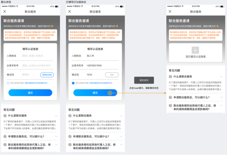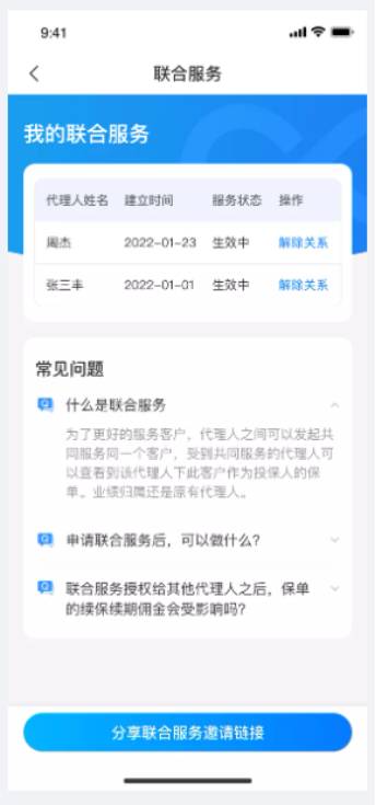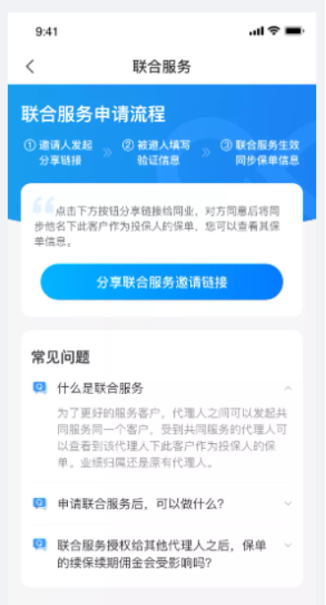 本次系统新增联合服务功能。发起申请的用户A若已经托管了客户C,在获得被邀请的用户B的系统确认后,将同步客户C在用户B账号下出单的全量保单信息给A账号。