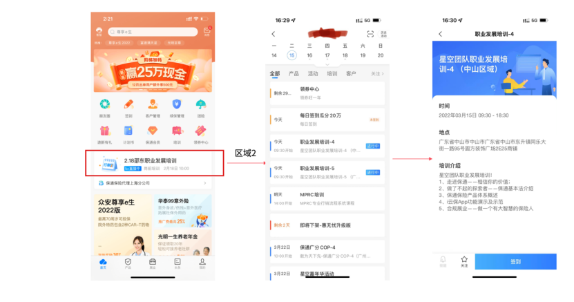 用户点击【区域2】,进入分公司行事历页面,点击对应线下培训可完成【签到】或观看线上直播