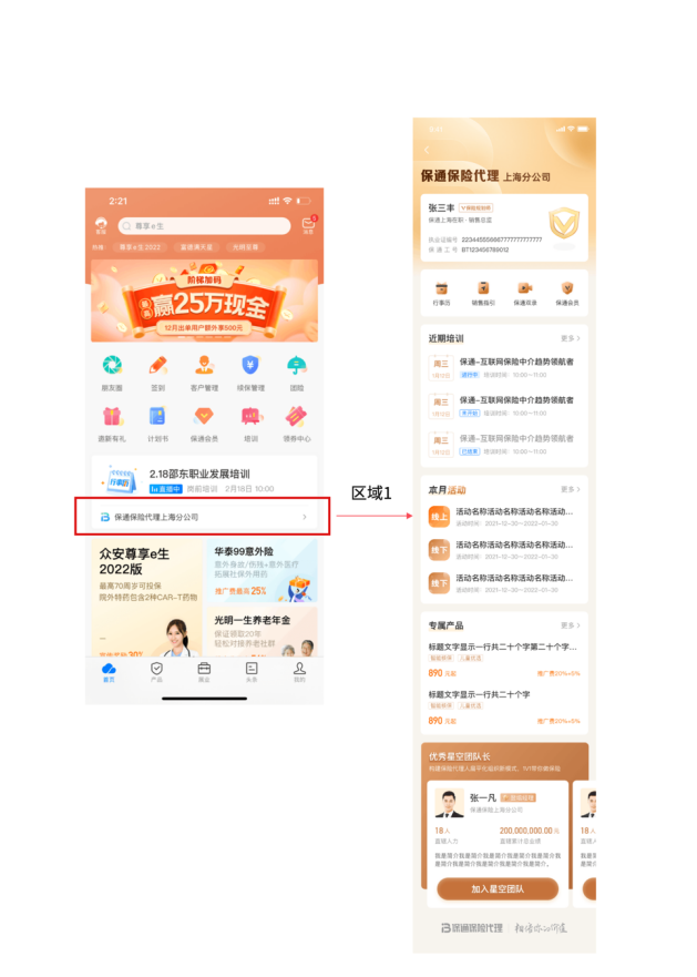 用户首页点击【区域1】,进入分公司区域话运营页面,根据用户入职所属分公司展示对应培训、活动、专属产品及星空团队介绍
