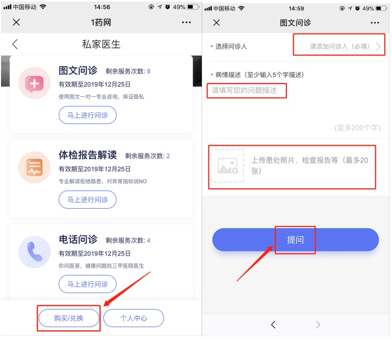 3. 点击“购买/兑换“可开始问诊环节