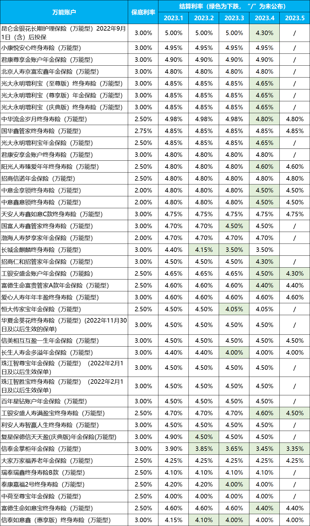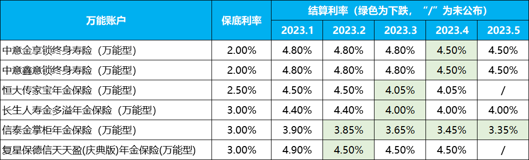 中意鑫意锁终身寿险(万能型):保底利率2%,4月结算利率从4.8%跌至4.5%,5月维持不变。