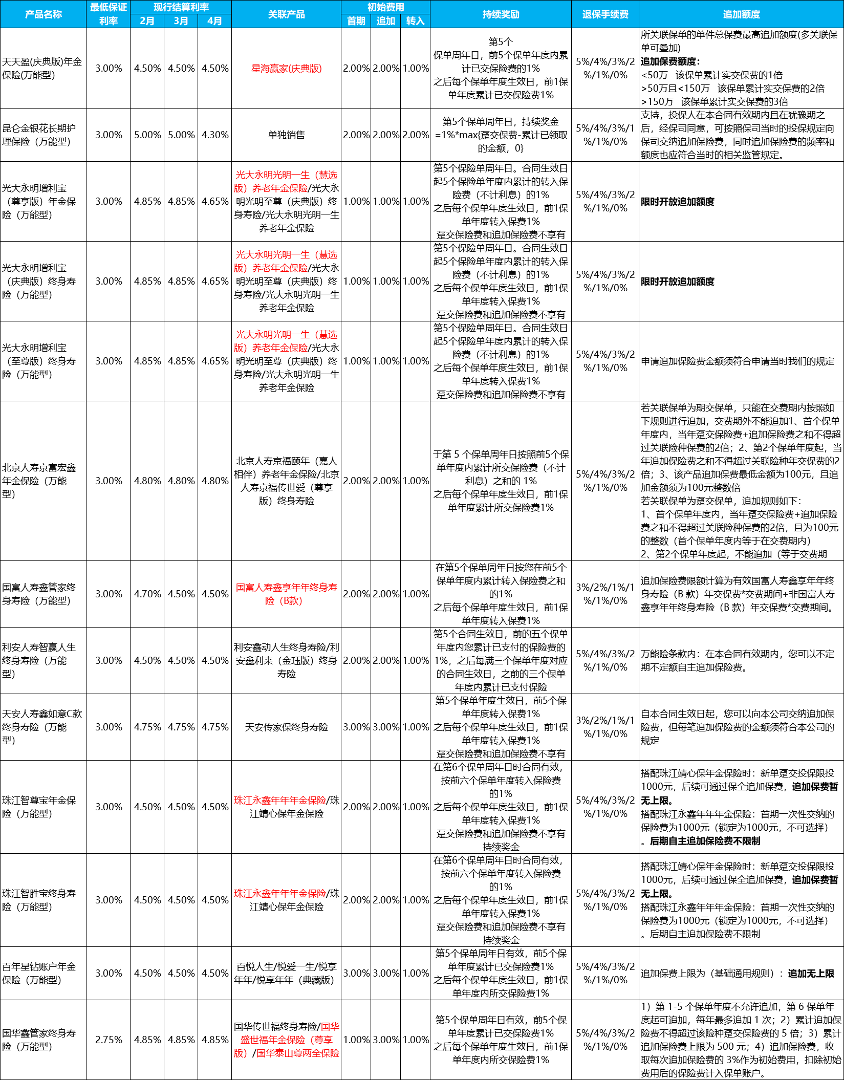 长生人寿金多溢年金保险(万能型):保底利率2.5%,3月结算利率从4.4%跌至4%,4、5月维持不变。