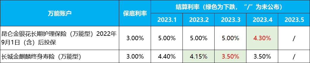 一款是昆仑金银花长期护理保险(万能型):3月结算利率高达5%,市面少见高利率,且已维持2年多的时间,一朝风云突变,4月结算利率跌至4.3%。