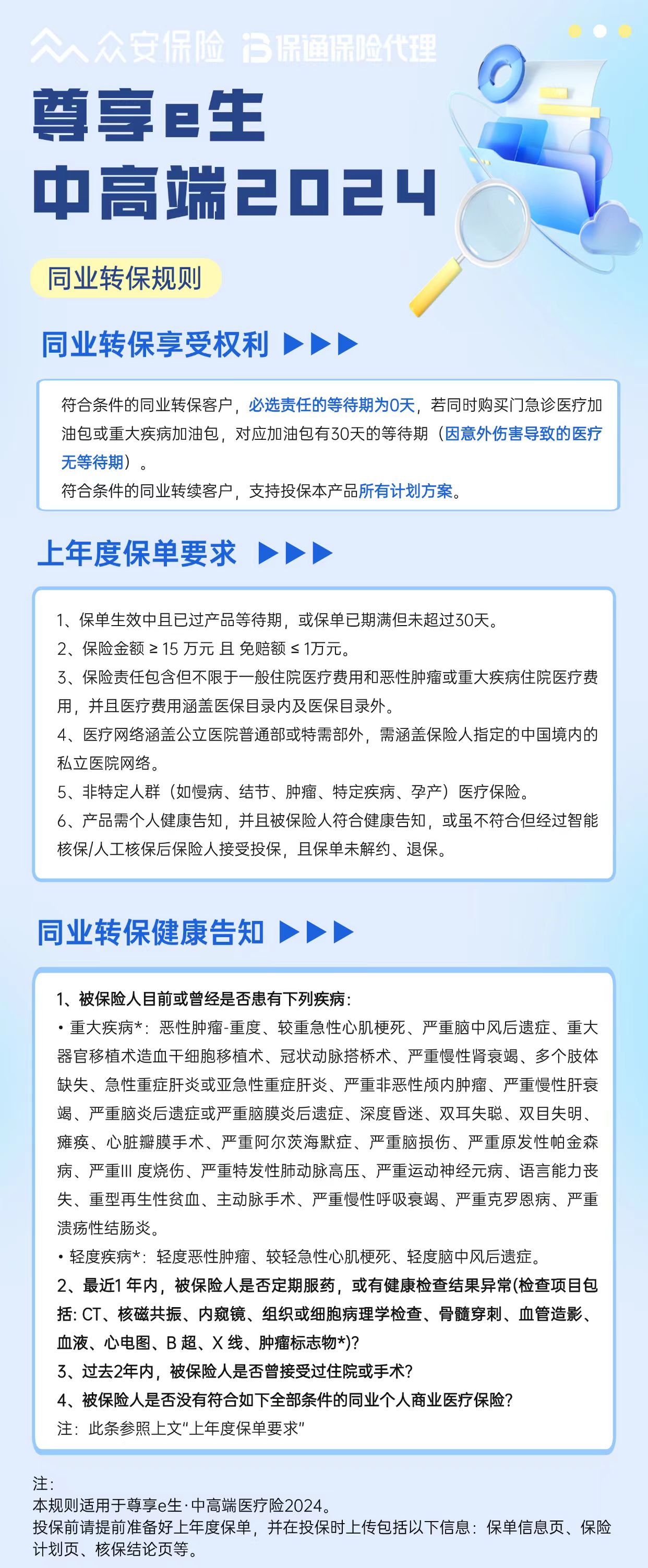满足下图中的条件,同业医疗险可免等待期转保至尊享e生中高端2024版,方案自由选择,且对于上一张保单在保期间首次罹患的、没有被新增除外的疾病,也能正常赔!