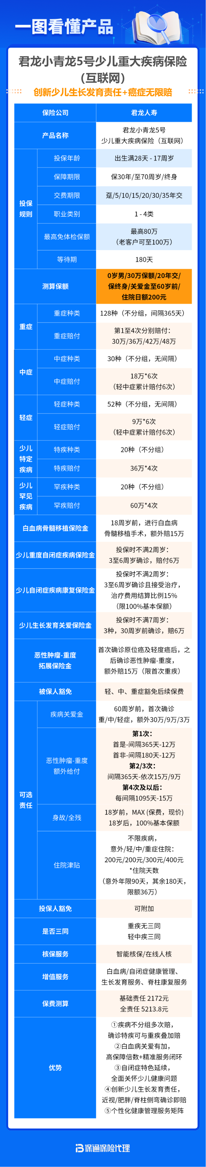 如果说君龙超级玛丽12号是成人重疾险性价比之王,那君龙小青龙5号就是儿童重疾险性价比之王,0岁买,一年只要2600左右,就能撬动50万高保额,相较同类产品更划算。