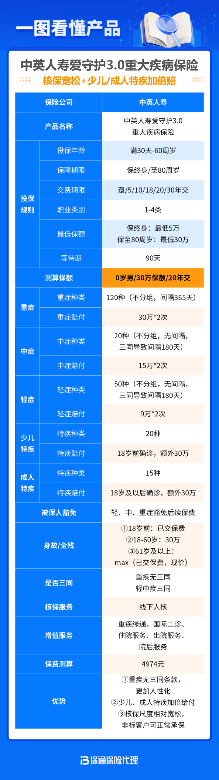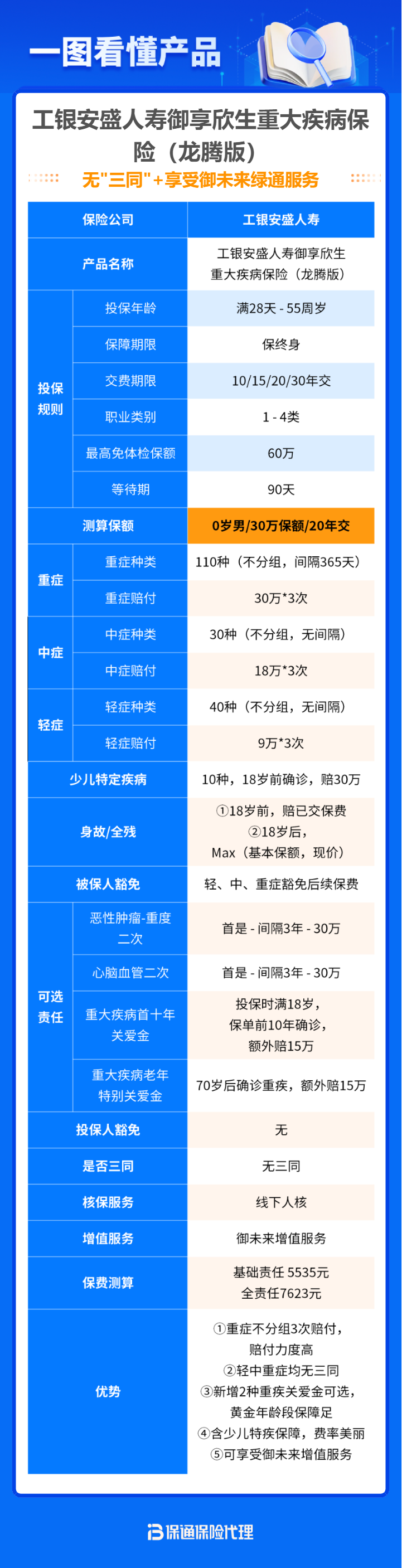 这是一款线下经代重疾险,2次赔、不分组、无三同,保障责任非常优秀,且核保宽松、增值服务优秀、价格友好,保险公司也是实力雄厚。