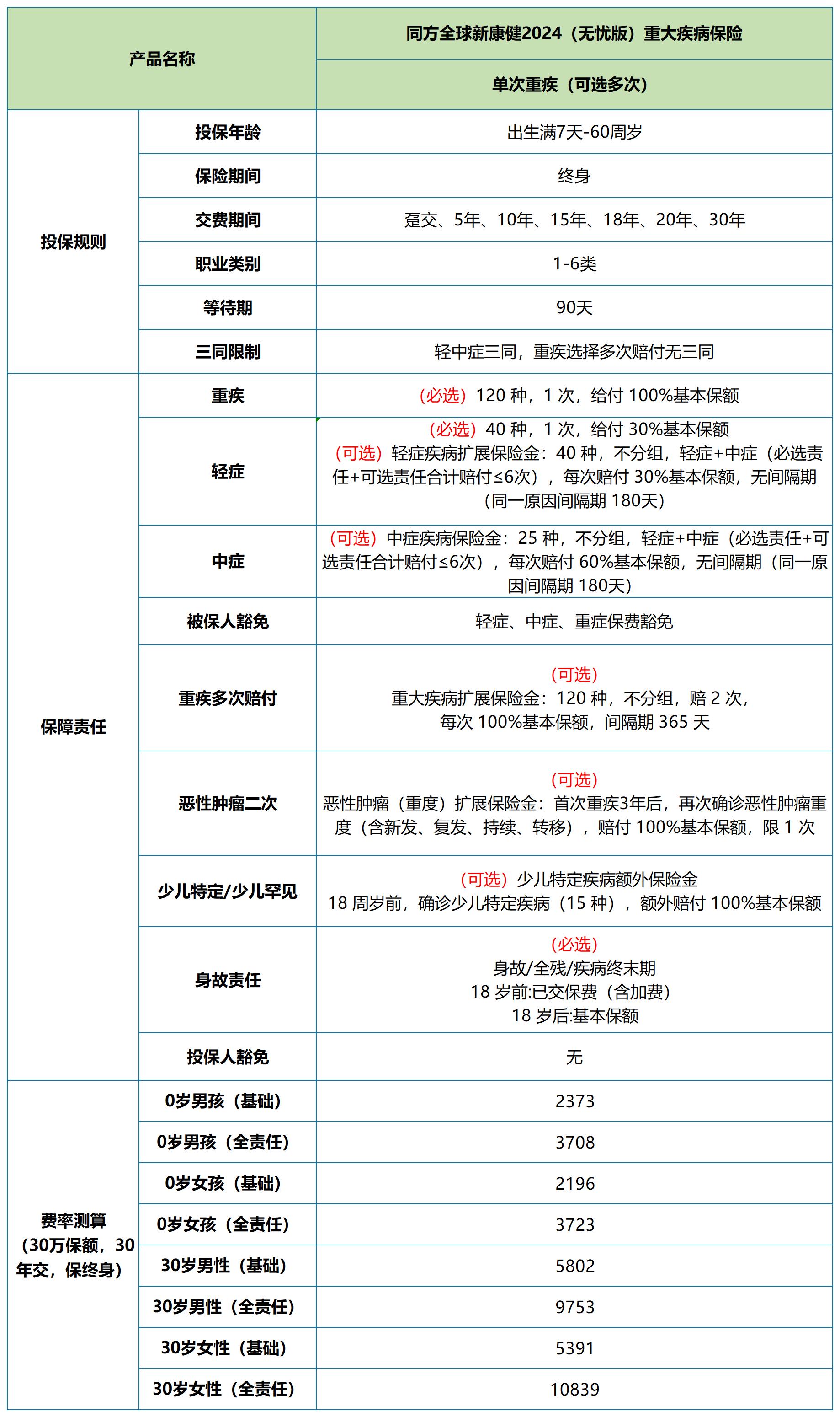 一款线下的单次赔付重疾险,它的保障更加纯粹,必选责任只有单次重疾+身故全残,轻症、中症、轻中症豁免被设计成了可选项,如果预算十分有限或想加保做高重疾保额,可只投必选责任,若首次投保且追求保障全面,那可选责任可以都选上。