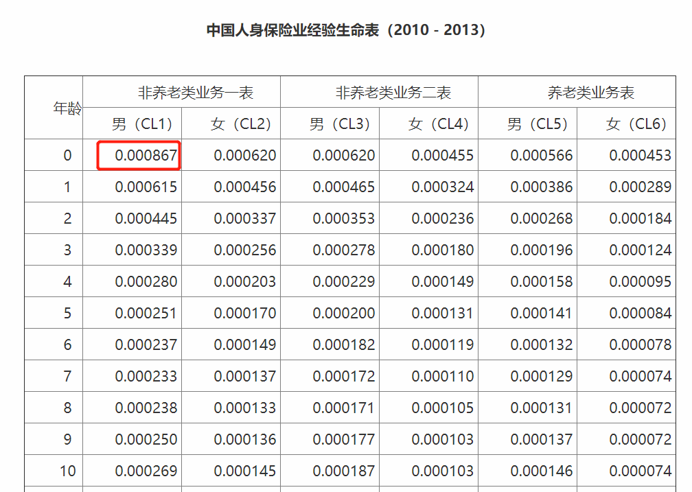 其中死亡发生概率表,又叫生命表,上面记录着从0岁开始,每个年龄段的死亡人数、死亡率,以及预期寿命等,它对包括养老年金险、寿险等人身险产品的定价有重要影响。