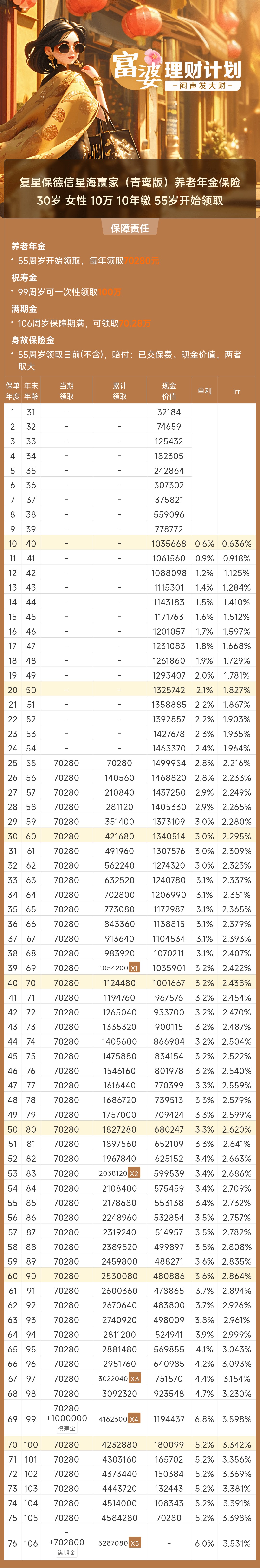 这是一款领取递增型养老年金,70岁前每年领取基本保额,70岁后领取每10年翻倍:70-79岁每年领200%基本保额,80-89岁可领到惊人的500%基本保额,如果有幸跨越90岁门槛,更能领到顶级的800%基本保额!