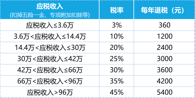 可参考下表,找到自己的应税收入对应的税率以及退税额: