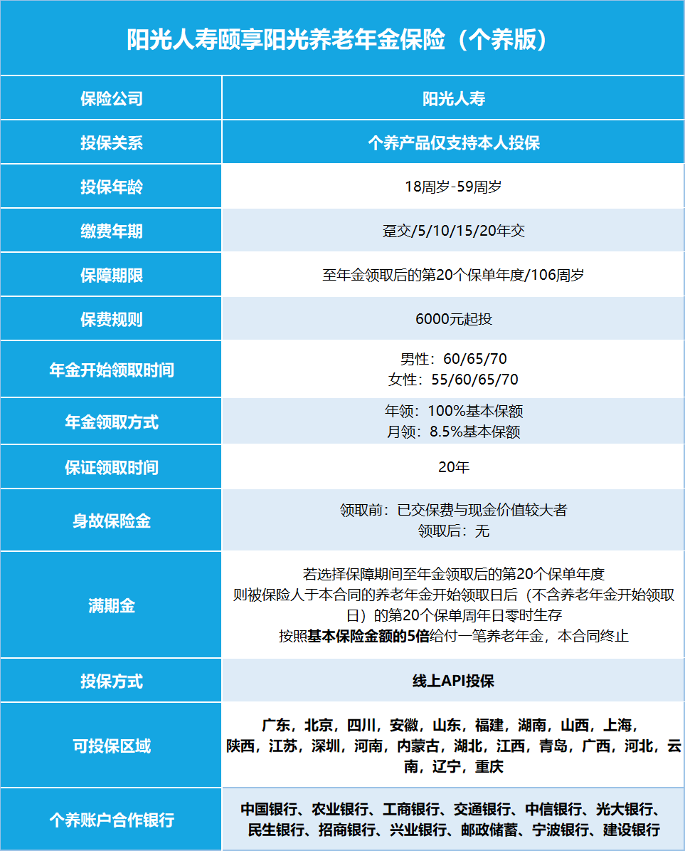 推荐产品:阳光人寿颐享阳光养老年金保险(个养版)