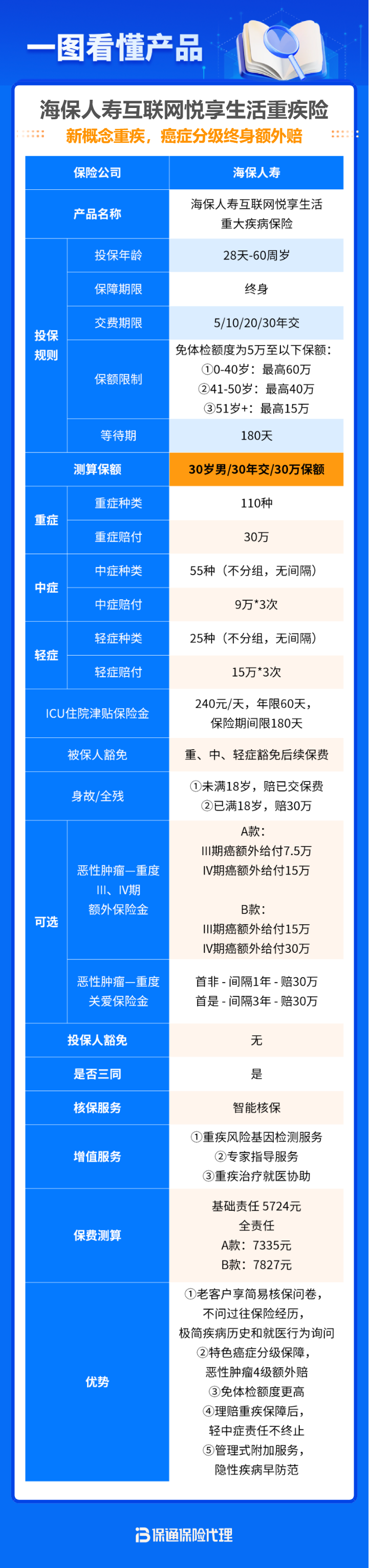 海保这款新品重疾险保障范围全面,重疾赔付后,非同组轻中症有机会继续保障,且可选恶性肿瘤-重度III期、IV期额外保险金,有力提升癌症的保障力度,还有ICU住院津贴保险金,应对高额医疗费用风险。