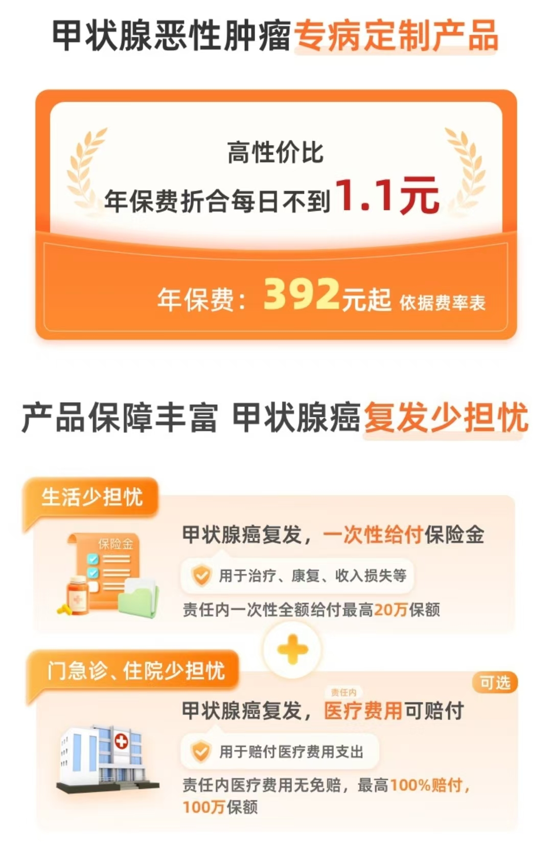 一,未来如果甲状腺癌二次复发,能一次性获得一笔最高20万的赔偿金,理赔款不限用途,可以用来解决看病费用,也能用来买营养品,还房贷、车贷、弥补收入损失等。