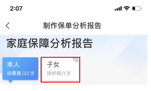 备注:该功能默认会把这个客户/家庭所关联的家庭成员都带出来,您可以为多个成员分别设置建议缺口及推荐产品,如希望此报告中不包含某成员,可点击成员右上角“叉”键把该成员删除。