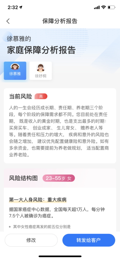 可在app内浏览最终会给客户呈现的报告,如有调整,可点击底部的修改按钮即可,如确认无误,可点击底部的转发按钮,分享给您的客户。