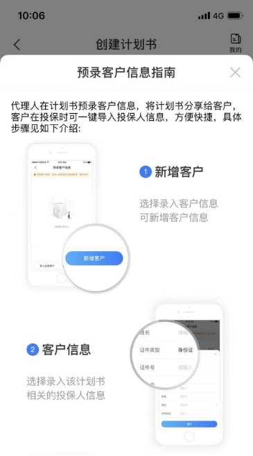1、计划书,新增客户信息预录功能,提升客户计划书投保效率