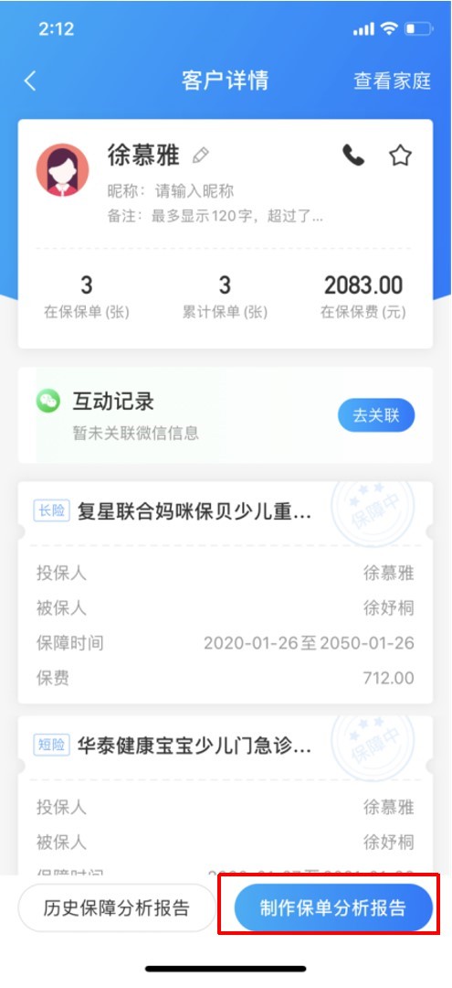 功能点:选中某个客户进入到客户详情或者家庭详情,可点击制作分析报告