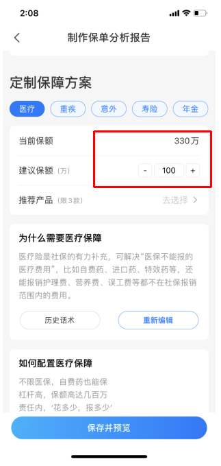 需要注意的是,只有当设置的建议保额大于当前保额的时候,该险种的推荐才会最终在给客户看的报告中展示出来。