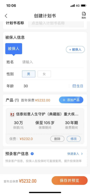 1、计划书:新增客户信息预录功能,提升客户计划书投保效率