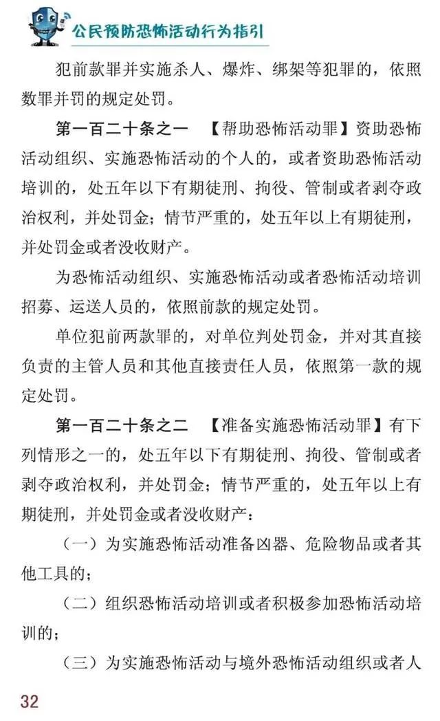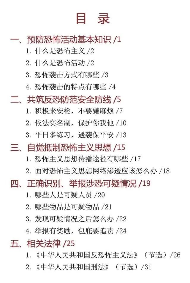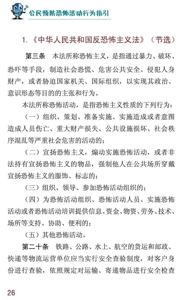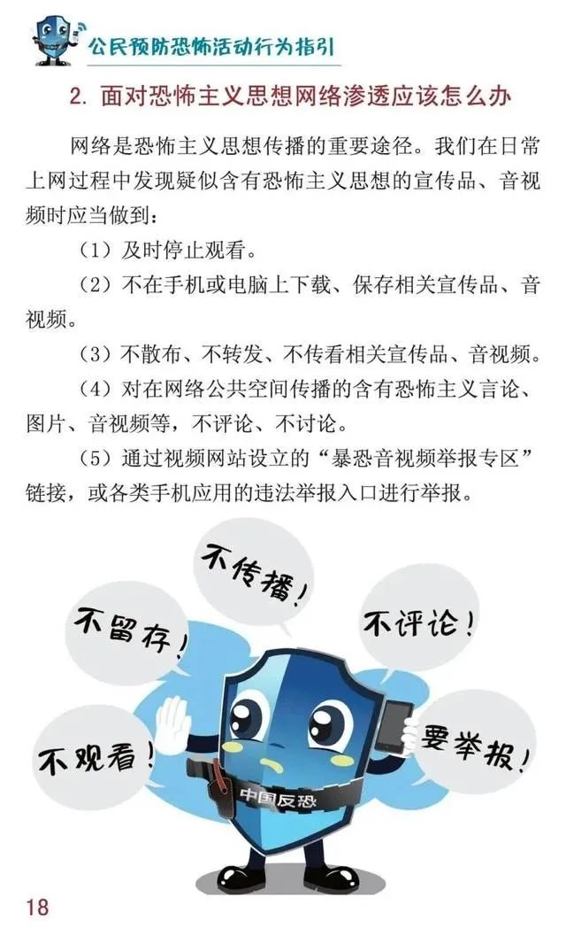 【反恐怖宣传】《公民预防恐怖活动行为指引》手册,你了解多少?由 baoxianshi2026年1月31日 什么是恐怖主义? 恐怖主义思想传播途径有哪些? 恐怖袭击方式有哪些? 发现可疑情况后怎么办? 遇到恐怖袭击该如何应对? …… 这些你都知道吗? 国家反恐办制作的 《公民预防恐怖活动行为指引》 手册给出了具体答案: 《公民预防恐怖活动行为指引》 发表回复 取消回复您的邮箱地址不会被公开。 必填项已用 * 标注显示名称 * 邮箱 * 网站 评论 * 在此浏览器中保存我的显示名称、邮箱地址和网站地址,以便下次评论时使用。
