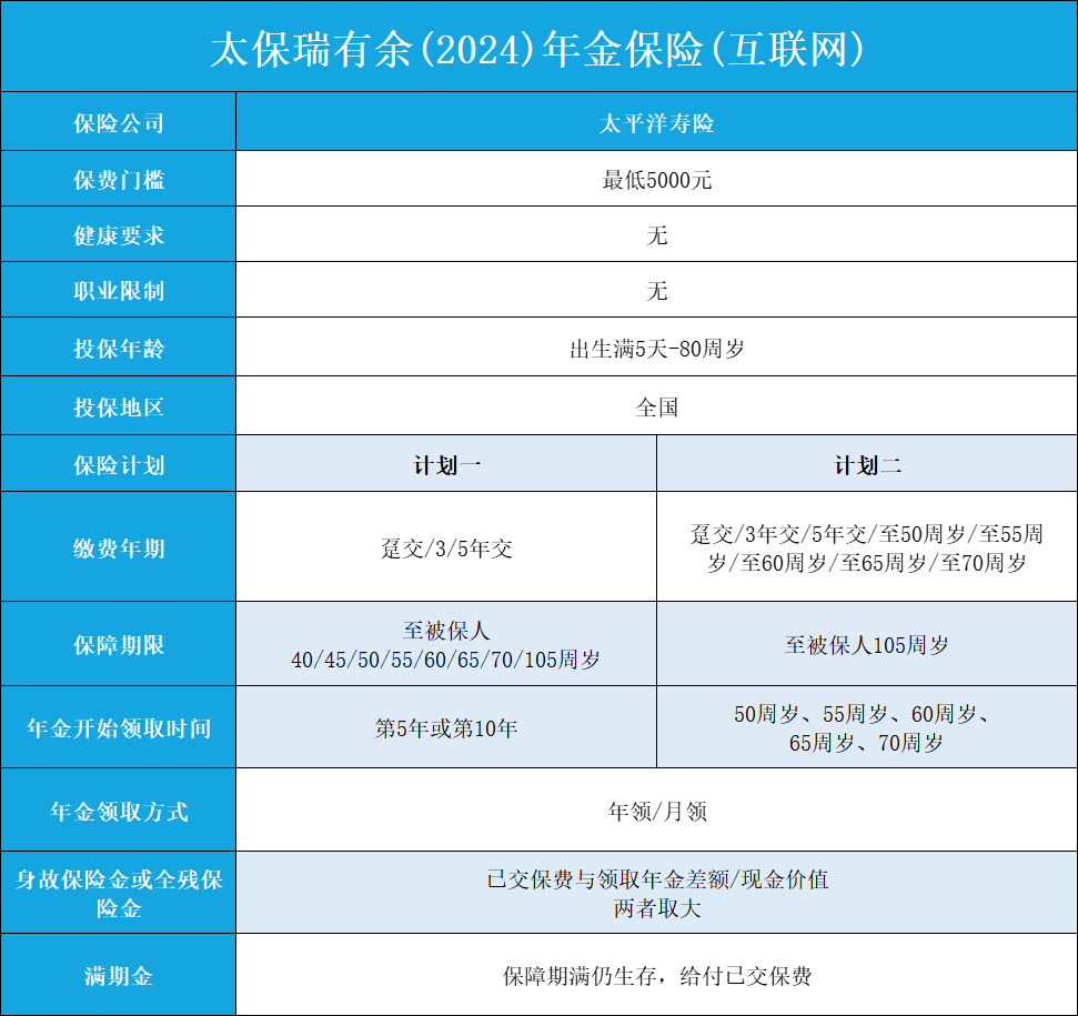 一、太保瑞有余(2024)年金保险(互联网)个养版