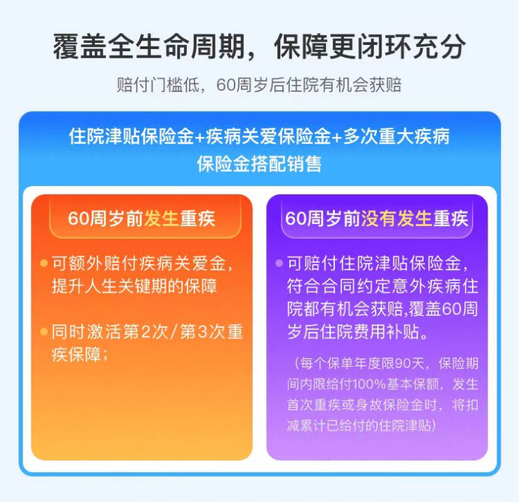 这就相当于,得重疾就按重疾赔,没有得重疾,60岁后住院也能赔钱,获赔的概率更大。