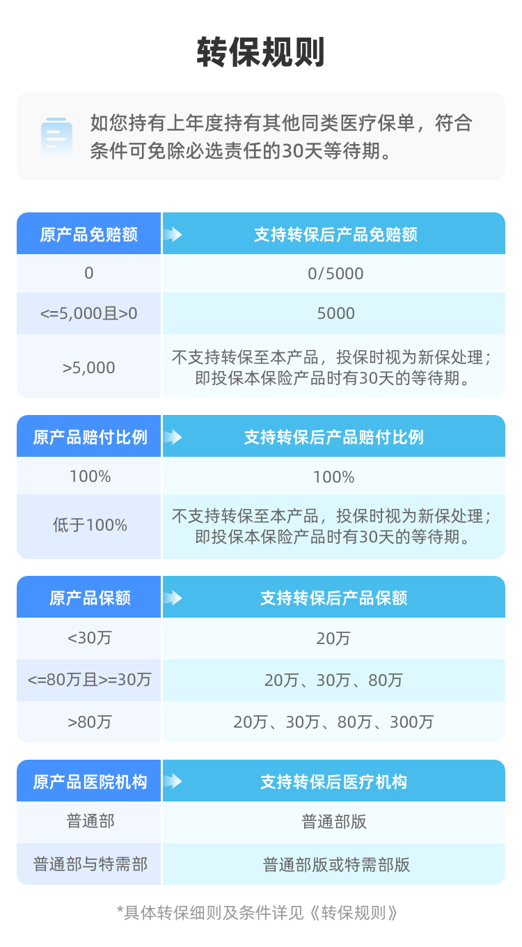 另外,如果你已经是尊享e生老客户,或者手上有别家的中端医疗险,符合条件可以转保过来,可能免除等待期,算是给“跳槽”开了个绿色通道。