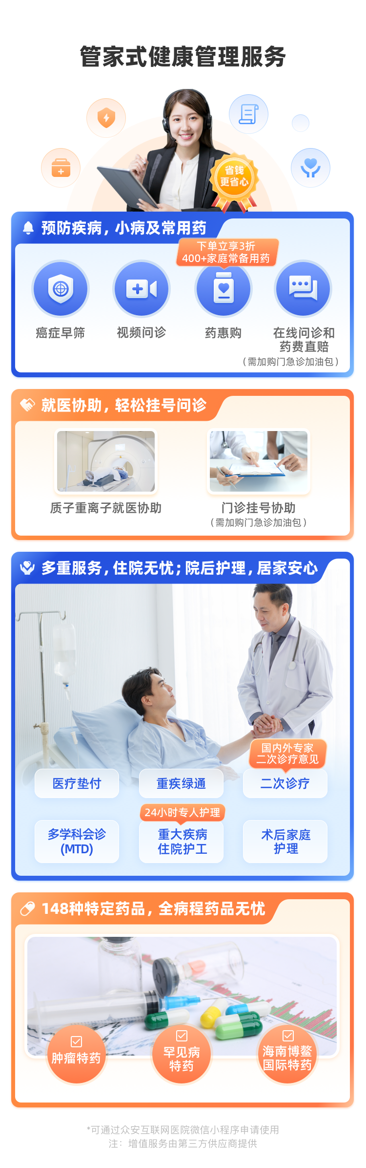 尊享e生的增值服务一直做得不错,中端版更是集大成。比如住院垫付(没钱也能先住院)、重疾绿通(帮忙安排专家、床位)、术后家庭护理、线上药品优惠等,一共15项。这些服务在关键时刻能解决很多现实难题,不仅仅是赔钱那么简单。
