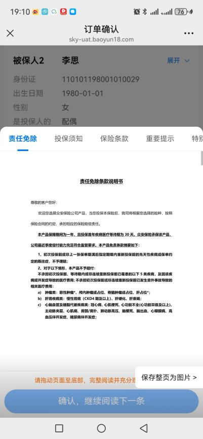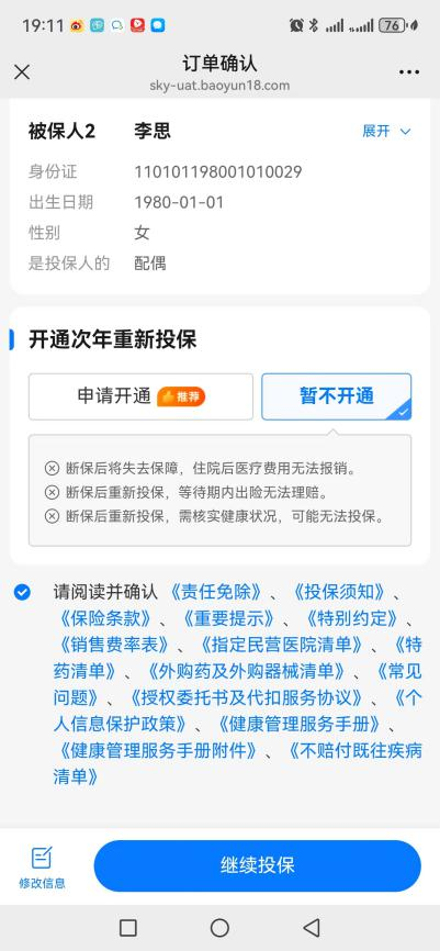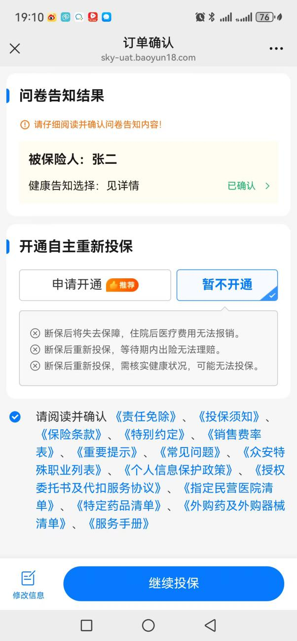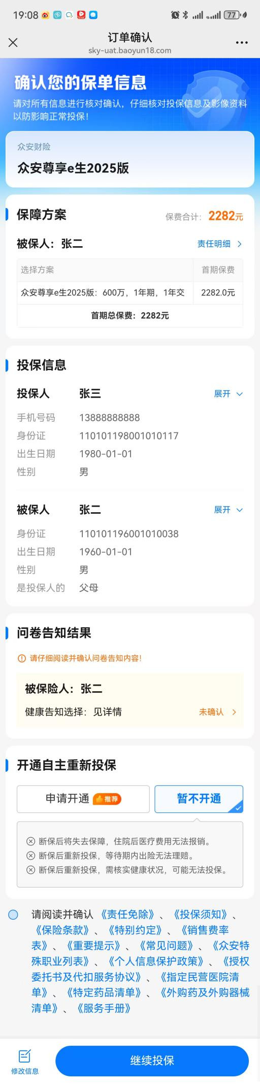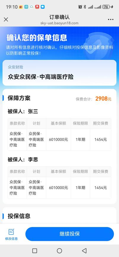 假设你先给父亲投保“众民保·中高端医疗险”。按照正常流程填写信息,直到进入“订单确认页”。