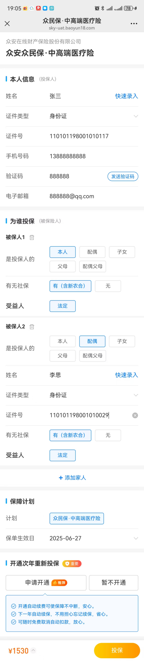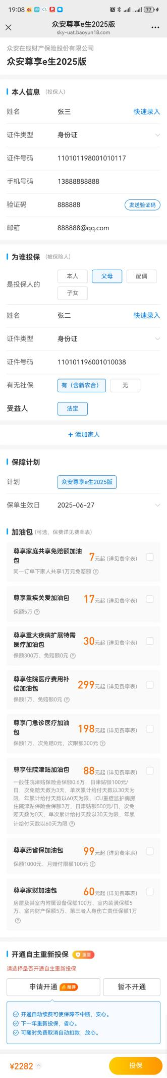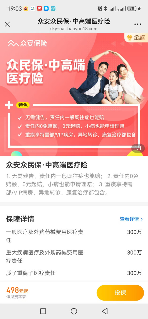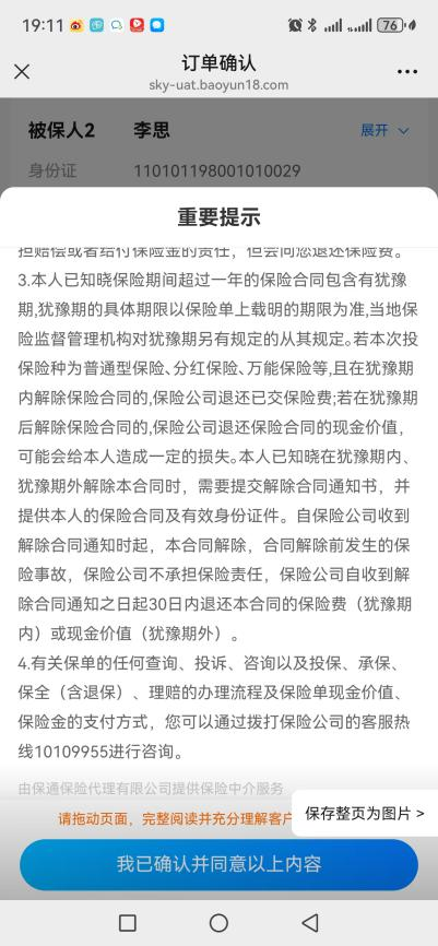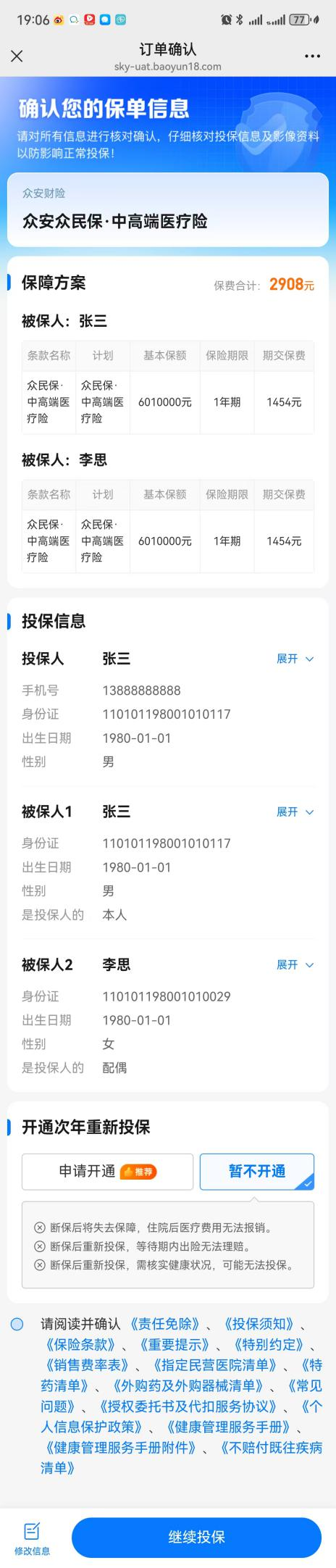 假设你先给父亲投保“众民保·中高端医疗险”。按照正常流程填写信息,直到进入“订单确认页”。