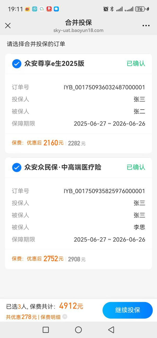 点击“查看合并订单”,这时你能看到一个订单列表,并且最直观的变化是:折扣人数显示了“2人”,应缴保费已经按照合并后的总保费计算了折扣。点击“继续投保”。