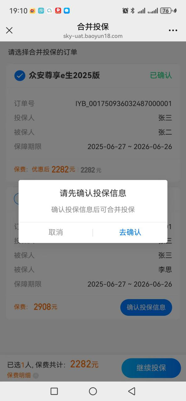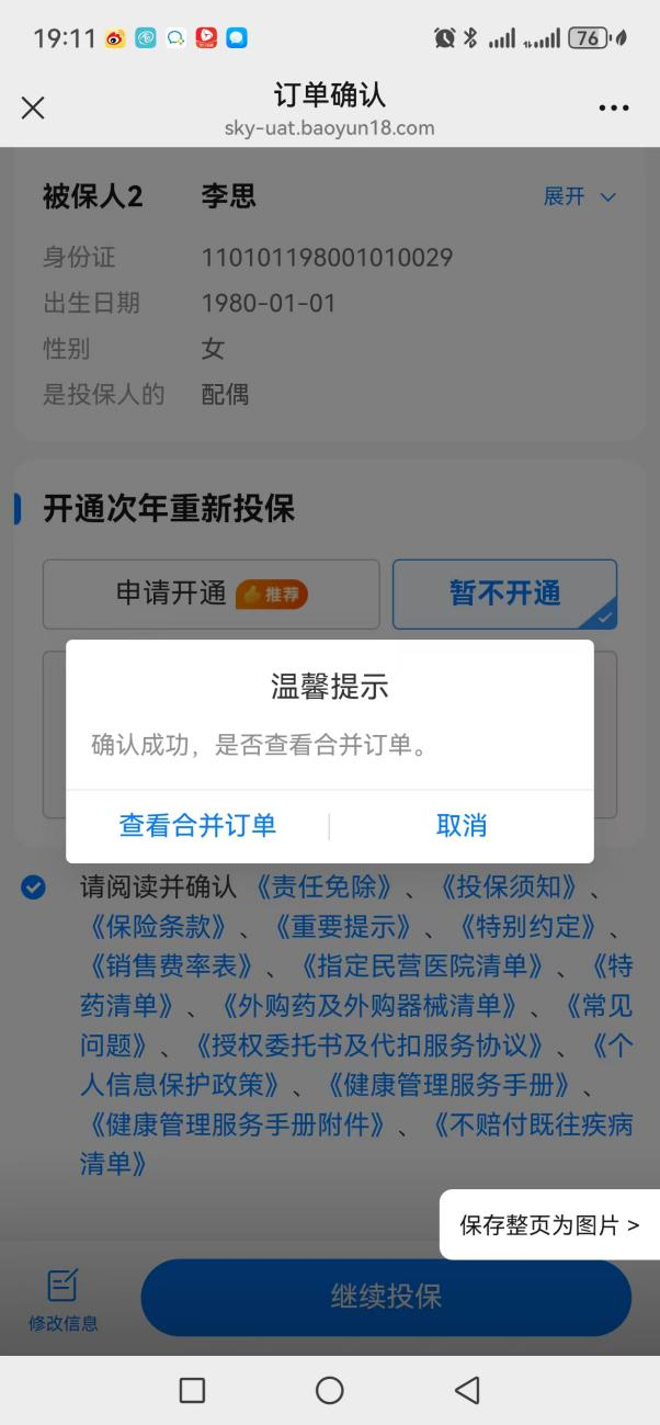 勾选时会再次弹窗提示,确认后,页面会跳转回第一个订单(父亲的众民保订单)的确认页。你需要在这里完成该订单的最终确认步骤。