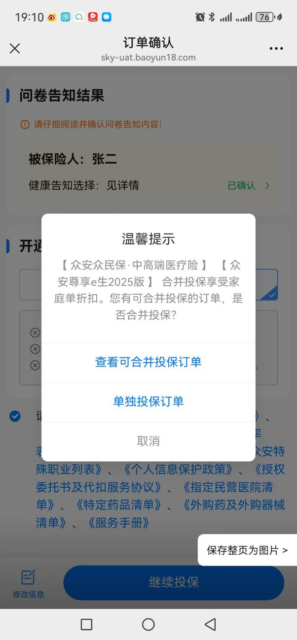 - “选择单独投保订单”:忽略合并,当前订单独立核保支付。