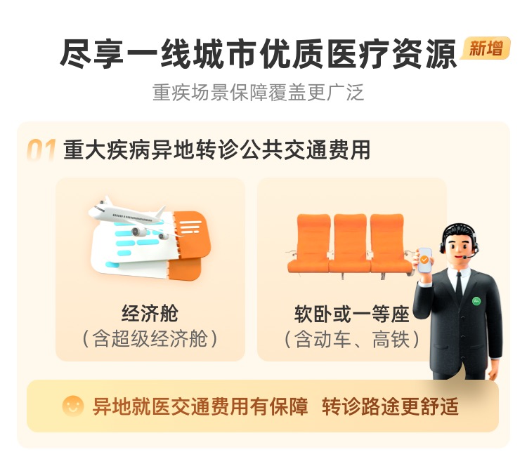 一是重疾异地转诊交通费,保额1万元。国内优质医疗资源集中,异地就医是常态。这项责任覆盖被保人和一名随行人员的公共交通费用(如飞机、火车),需要医院开具转诊证明。对于从三四线城市前往一线城市治疗的家庭,能实实在在减轻负担。
