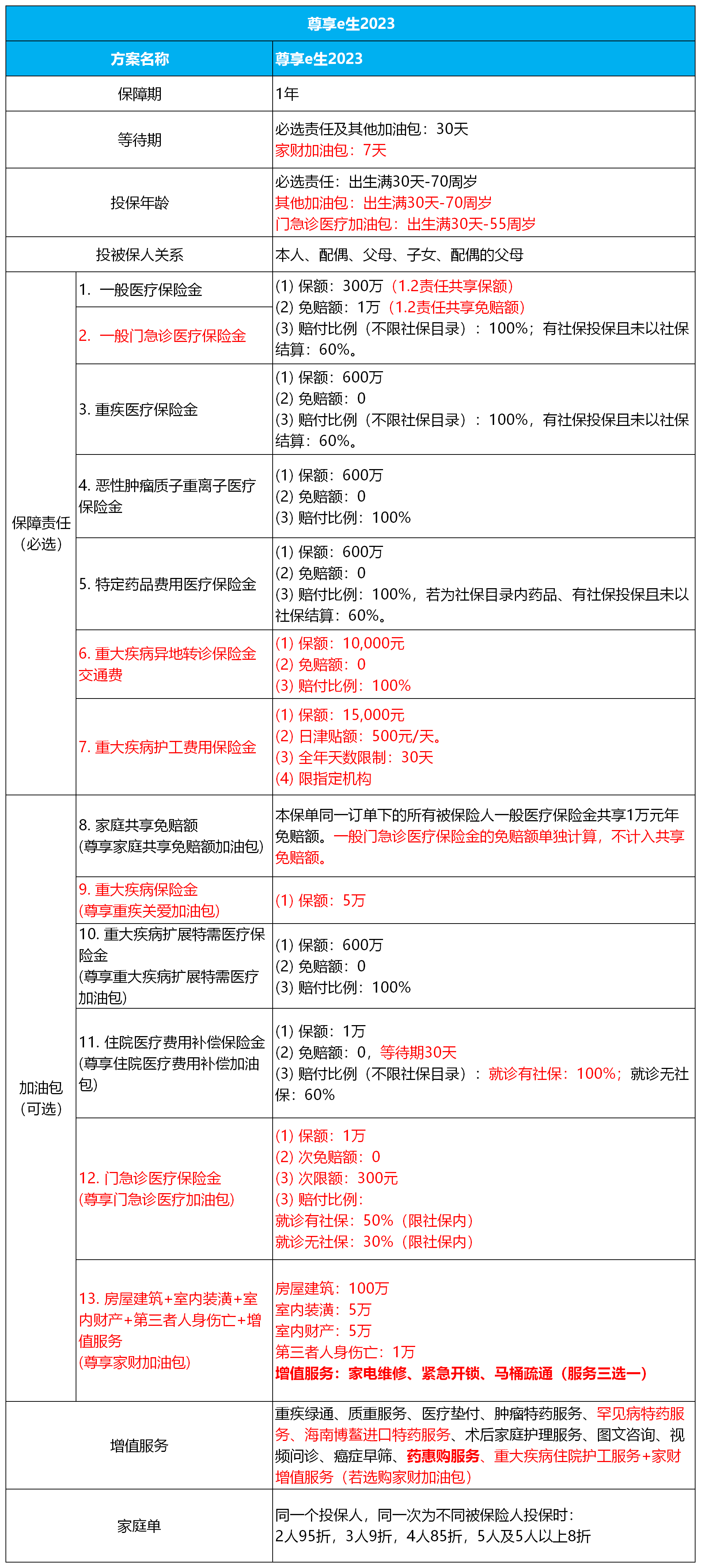 “加油包”是尊享e生的特色,2023版新增了“门急诊医疗加油包”和“家财加油包”,并升级了“重疾保险金”责任。
