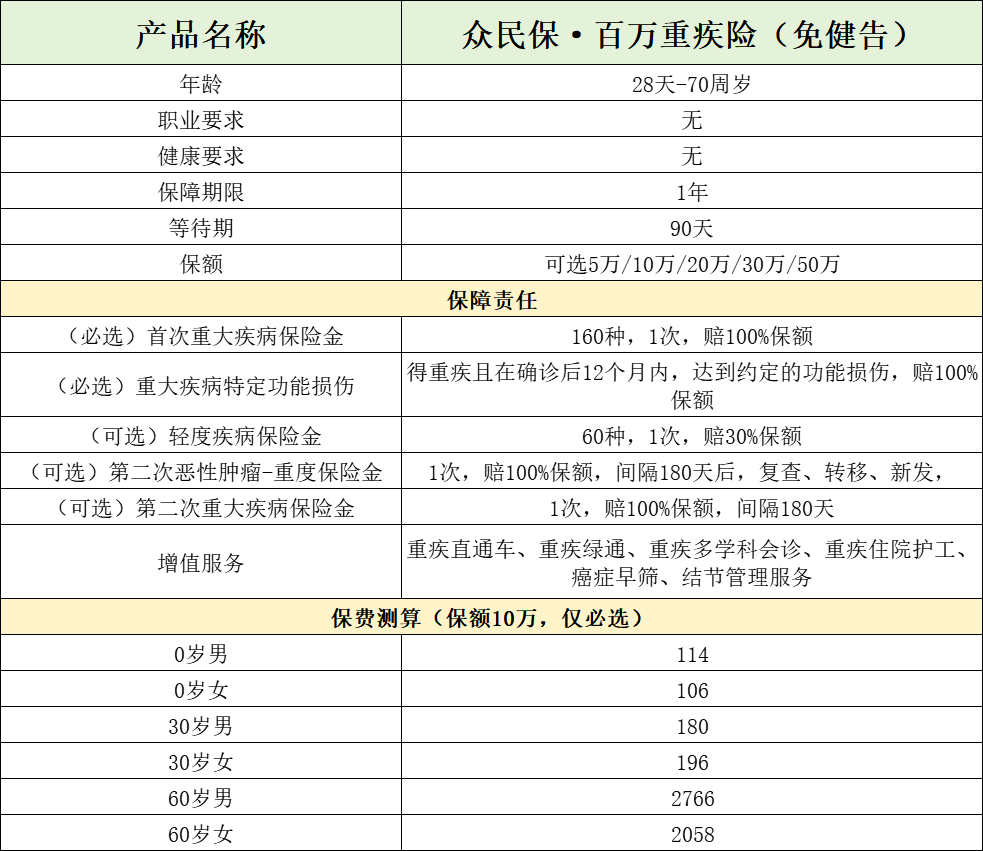 简单说,这是一款门槛极低的一年期重疾险。它最大的卖点就三个:免健康告知、无职业限制、高龄可投(最高70岁)。听起来很美,对吧?但它不是万能的。它的本质,是为特定人群提供一个“兜底”的可能,而不是完美的替代品。