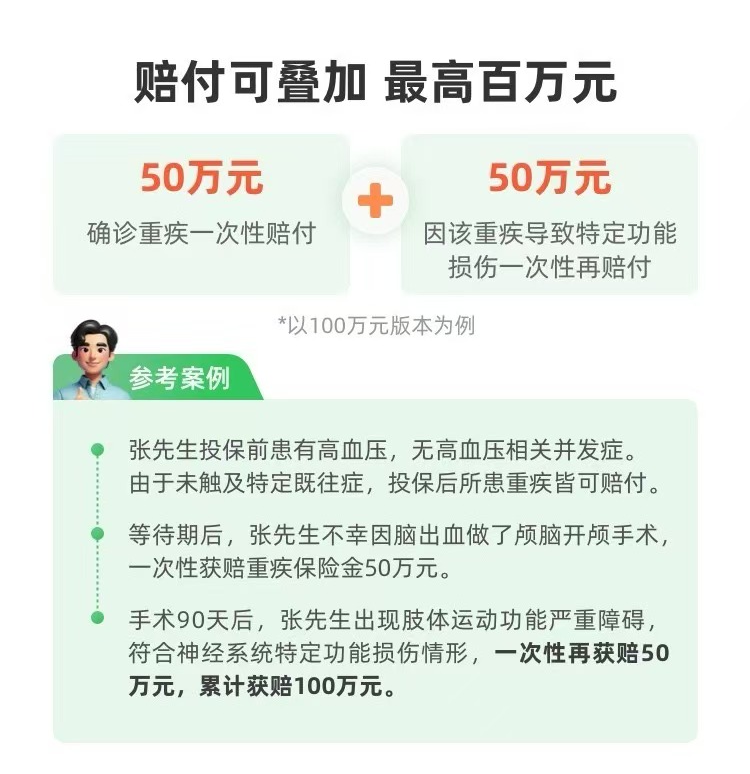 保160种重疾,赔100%保额。它有个特色是“重大疾病特定功能损伤保险金”,如果重疾导致了合同约定的失明、瘫痪等严重功能障碍,可以再赔一次100%保额。也就是说,选50万保额,最高有机会拿到100万。这在一年期产品里不多见。