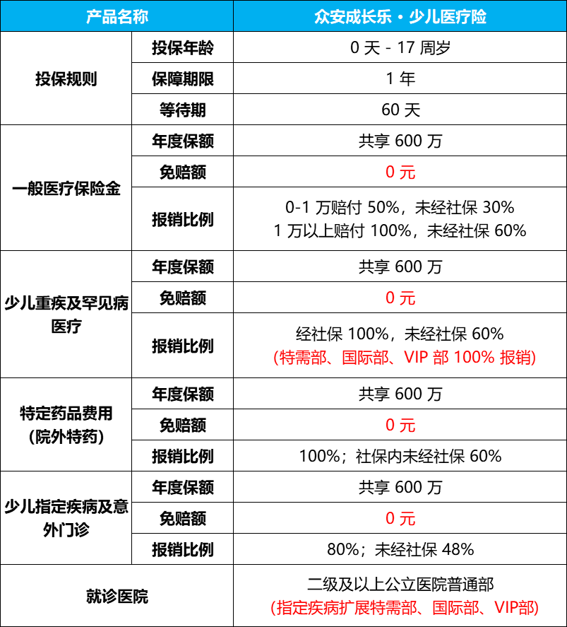 有没有可能用一份产品解决这个问题?最近众安推出的“成长乐”少儿医疗险,提供了一个不同的解题思路。它的核心设计是:取消固定的1万元免赔额,采用阶梯式报销。