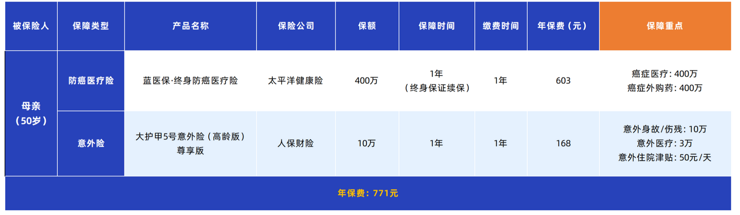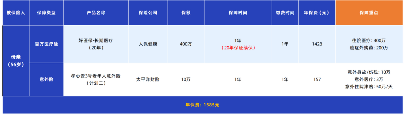 如果父母有高血压、糖尿病、心脏病等慢性病,大概率买不了百万医疗险了。别灰心,我们还有“平替方案”:防癌医疗险 + 意外险。