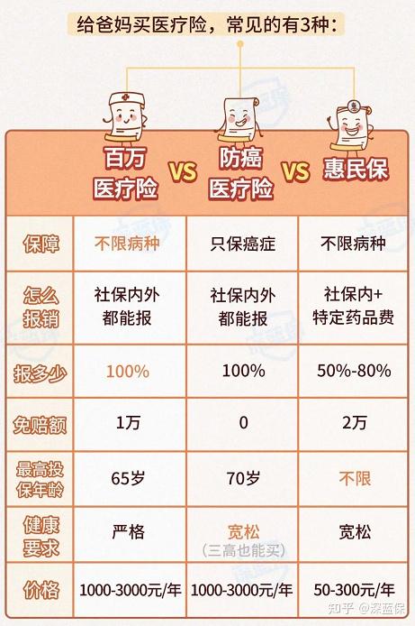 - 防癌医疗险:如果因为高血压、糖尿病、冠心病等买不了百万医疗险,就选这个。它只保癌症相关的医疗费用,但健康告知宽松很多,三高通常都能买。癌症是老人最高发的重疾之一,保住了这个,也解决了大部分问题。