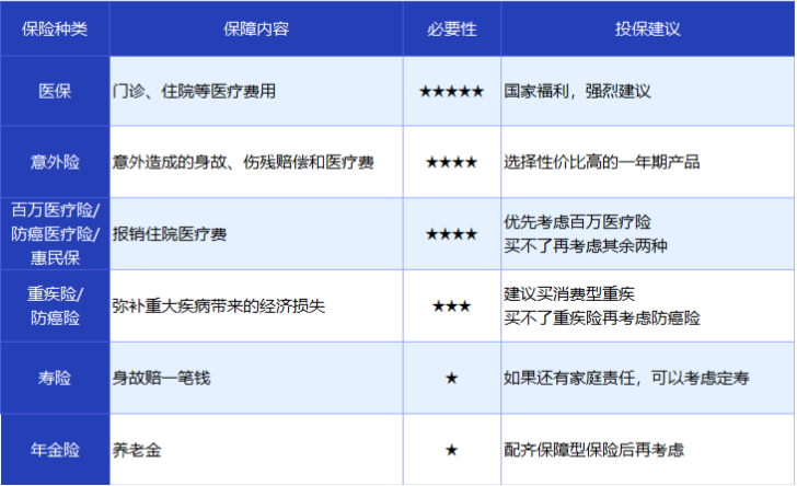 在基础保障(医保、医疗险、意外险)没配齐之前,任何理财类保险都请往后放。