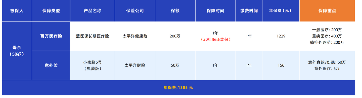 这套方案每年保费一千多,保障非常扎实。医疗险建议选择能保证续保20年的产品,这样在未来20年里,无论产品是否停售、父母身体是否变差,都能稳稳地续下去,解决了最大的后顾之忧。