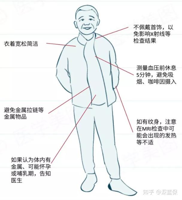 穿宽松、分体衣服,方便穿脱。别戴首饰,别穿有金属扣的内衣,影响X光、CT。